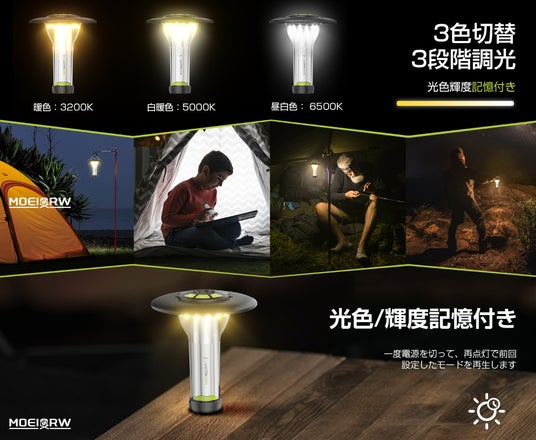 - ランタンモード:暖色(3200K)、白暖色(5000K)、昼白色(6500K)の3色と、明るさ3段階で設定可能。