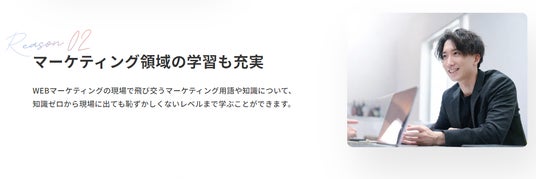 WEBデザインの基礎学習からスタートし、バナーやLPの課題制作を実際に手を動かしながら、WEBマーケティングの現場で必要なスキルを習得することができます。