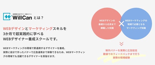 WillCanはWEBマーケティングの第一線で活躍するマーケターが監修し、 WEBデザイナーが身につけておくべきマーケティング知識・思考を網羅したカリキュラムをご提供いたします。
