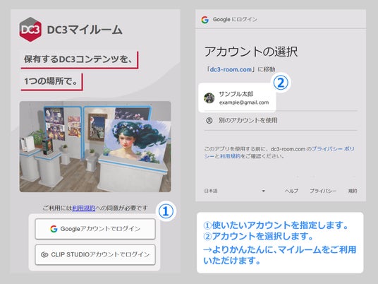 DC3マイルーム・事業者コンソールにGoogleアカウント・CLIP STUDIOアカウントを利用してログインできるようになりました。新規にメールアドレス・パスワードを登録することなく、既にお持ちのアカウントで簡単にログインすることが可能です。