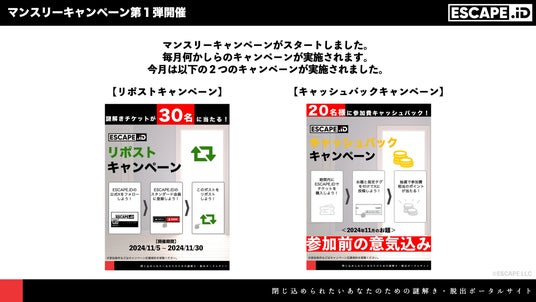 毎月のお題(11月のお題は「参加前の意気込み」)をチケット購入時に呟くだけで、参加費相当のESCAPEポイントが抽選で20名に当たるキャンペーンを実施しました。