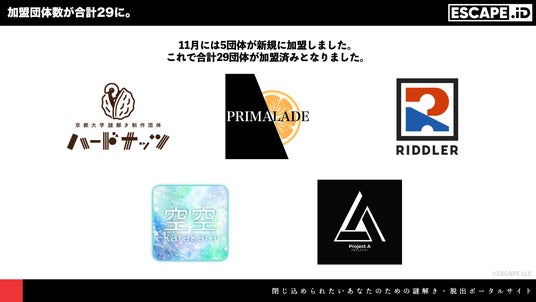 ESCAPE合同会社(所在地:東京都品川区、統括プロデューサー 佐々木 翼)の運営する謎解き・脱出ゲームに特化したチケットポータルサイト「ESCAPE.ID」が、リリースから3ヶ月が経過しました。11月には新たに5つの団体が加盟し、総加盟団体数は29団体となりました。また、譲渡機能をはじめとする新たな機能も追加され、よりよいサービスに向けた開発が進んでいます。