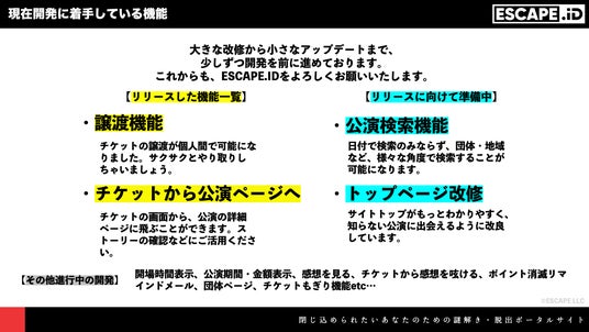 今後もESCAPE.IDは、謎解き・脱出ゲームに参加したい皆様に寄り添い、使いやすいサービスとして進化してまいります。