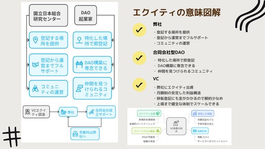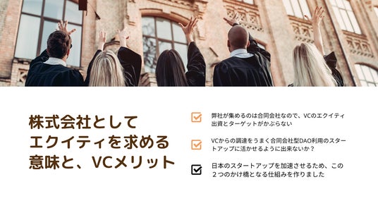 何故、運営は株式会社か?合同会社型DAOを多く抱える場所として、自身も合同会社型DAOで立ち上げるアイディアもありました。しかし合同会社ではM&A以外のEXITが難しくIPOはできない以上、ここは株式会社として合同会社型DAOではうけられないVCなどからのエクイティ・ファイナンスを得て急成長&IPOを目指すのが得策との考えました。よって今後、調達活動をスタートいたします。