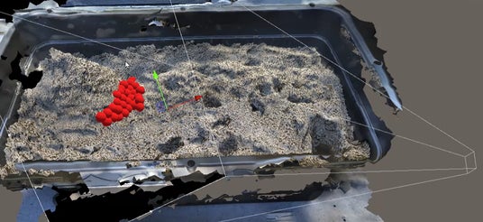 砂地の一部に水を浸潤させて、その浸潤した箇所を赤外線カメラで検出し3Dモデル上にプロットした様子を紹介します。