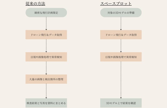 従来のドローンによる異常個所検出のフローとスペースプロットを用いたフローの改善イメージ