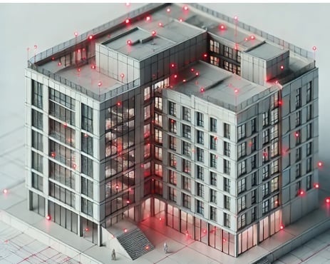 水分が多く含まれる箇所の検出場所を赤い点として3Dモデル上にプロットした例