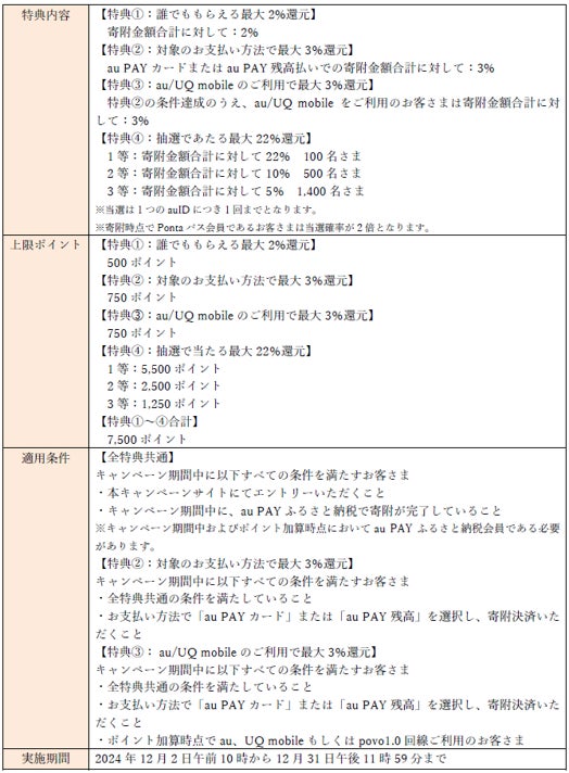 そのほか詳細はこちら(https://furusato.wowma.jp/announce/campaign_241202/)をご確認ください。