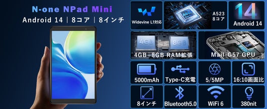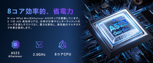 Npad Miniは、8インチディスプレイと8コアプロセッサ「A523」を搭載し、マルチタスク処理が可能でスムーズな使用体験を提供します。