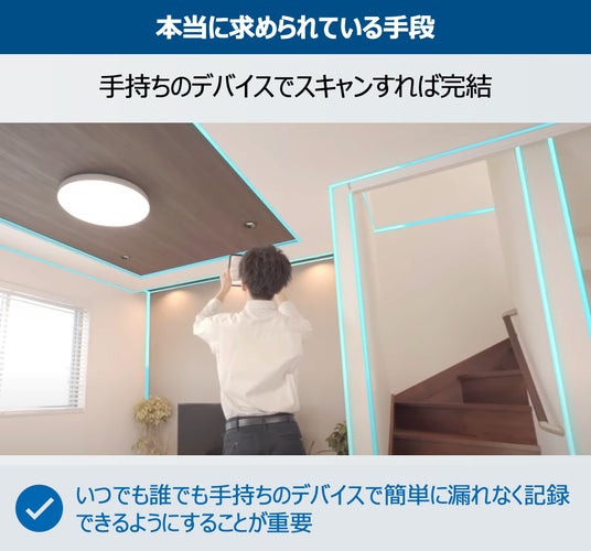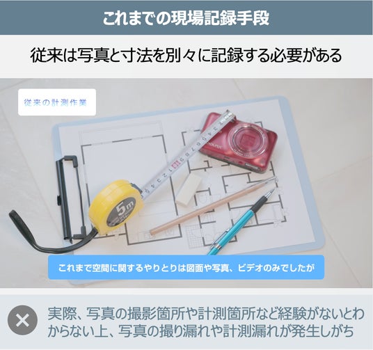 いままで空間や現場を寸法付きで記録したいときに、カメラとメジャーしか連想されない世界でした。さらに業務となると経験がある複数のスタッフが現場に出向き、全ての箇所をメジャーなどで1箇所ずつ計測し紙に記録することや、数百枚の写真を撮るといった属人的な記録手法では、測り忘れや撮り忘れがどうしても避けられず、現場に何度も足を運ぶといった付加価値のない作業が生まれます。また、その空間を社内や社外の関係者に共有するのも各担当者がFAX、電話、紙、写真など伝統的なツールを用いていますが、三次元の空間を齟齬なく各所に伝えることは難しく、顕在化された課題となっています。