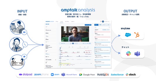 「amptalk analysis」は、IP電話やテレビ会議システムなどあらゆるコミュニケーションツールと連携し、オンライン・オフライン関係なく商談や通話を自動で書き起こし・要約・解析し、Salesforce / HubSpot / Slack / Microsoft Teamsチャットに自動出力することで、オンライン商談を自動化・可視化します。「amptalk analysis」を用いることで、あらゆる企業のセールスイネーブルメントを実現し、インサイドセールスからフィールドセールス、カスタマーサクセスまで営業組織全体の生産性向上を支援します。