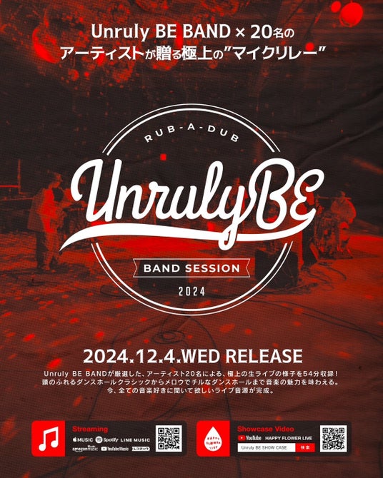 ストリートミュージックの最前線を走るバンド UnrulyBE が贈る、新感覚ライブアルバム『UnrulyBE SHOWCASE-バンドラバダブセッション-』がリリース! 総勢20名のアーティストが参加した圧巻のパフォーマンスを、サブスク音源とYouTube映像の両方で楽しめます。ストリートミュージック専門チャンネル 『HAPPY FLOWER LIVE』 との強力コラボレーションでお届けする、音楽の新たな魅力を発信!