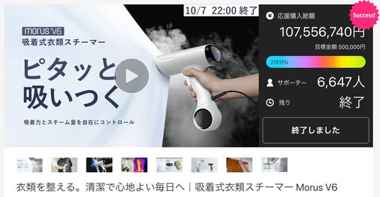 応援購入サイトMakuakeで応援総額1億円を突破、歴代アイロン部門で1位に輝いた吸着式衣類スチーマー「Morus V6」が、待望の一般販売を開始!