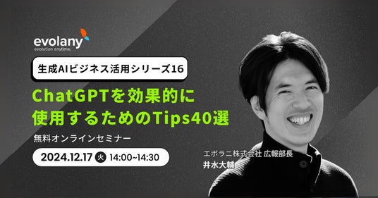 【エボラニ株式会社】2024年12月17日(火)14:00~14:30 【生成AIビジネス活用シリーズ16】ChatGPTを効果的に使用するためのTips40選
