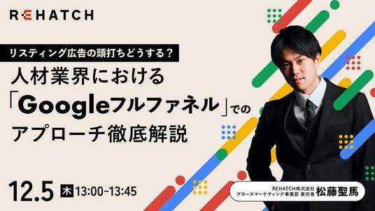 REHATCH株式会社は、2024年12月5日(木)13:00~人材業界におけるGoogleのフルファネルでのアプローチ方法について解説するセミナーを開催いたします。