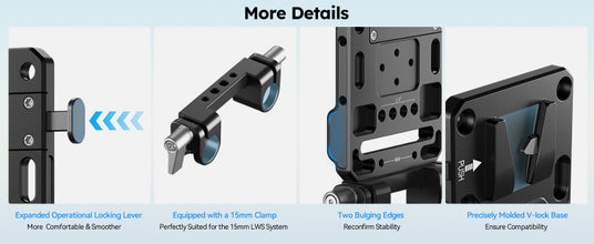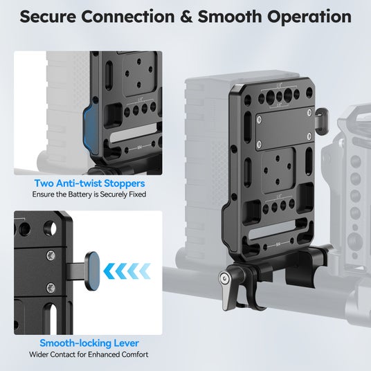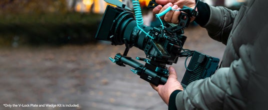 このVマウントバッテリープレートとウェッジキットは、よりスムーズで快適な操作を提供するクイックリリースレバーを搭載した、改良されたVロックメカニズムを採用しています。これにより、バッテリーの取り付けや取り外しが簡単で迅速になり、撮影中の時間短縮が実現します。