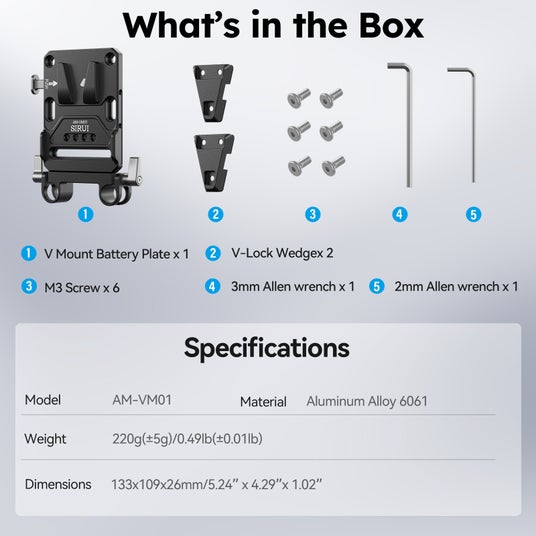 新しくアップグレードされたSIRUI Vマウントバッテリープレート AM-VM01セットは、互換性と安定性を強化するために精密な再設計と金型のアップグレードが行われています。セットにはバッテリープレート1枚とウェッジプレート2枚が含まれており、完璧なフィット感を保証し、ぐらつきをなくすように設計されています。これにより、より安全で多用途な体験を提供し、映像制作やカメラ機材の構築において信頼性を高めます。