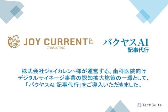 株式会社ジョイカレント様は歯科医院専門デジタルサイネージ事業を展開されております。本事業の認知施策の一環としてAI活用のSEO記事執筆サービス「バクヤスAI 記事代行」を導入いただきました。