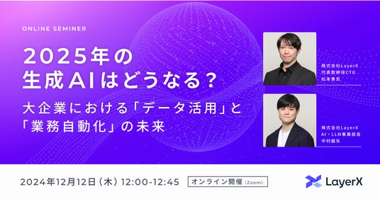 株式会社LayerXは、「2025年の生成AI」と大企業における「データ活用」と「業務自動化」をテーマにしたセミナーを2024年12月12日に開催します。 「チャットツールやRAGを入れたけど思うように使いこなせない」「導入後の次のステップがわからない」といった課題に直面されている企業のご担当者様向けにぜひご参加いただければと思います。