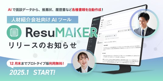 『採用イノベーション』の株式会社ウィルビー(本社:東京都台東区、代表取締役:江本亮、以下ウィルビー)は、AIが面談記録から求職者本来の魅力を引き出す推薦状・履歴書・職務経歴書の自動作成ツール『ResuMAKER』の提供を2025年1月に開始いたします。