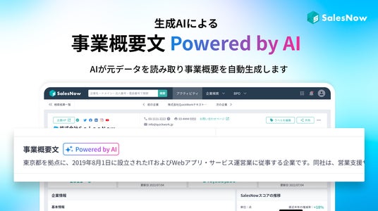 株式会社SalesNow(本社:東京都渋谷区、代表取締役CEO:村岡 功規)は、セールスチームの武器となるデータベース「SalesNow」にて、生成AIによる「事業概要文 Powered by AI」をリリースしたことをお知らせします。これにより、事業概要が文章にて一目で分かるようになりました。情報収集工数を削減し、営業各自の生産性向上が可能となります。