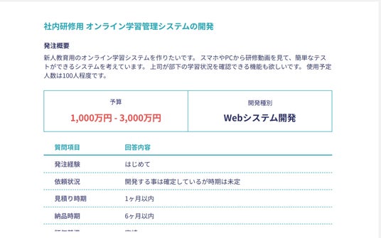 開発会社は企業情報を掲載することができ、リスクやコストをかけずに新しい案件獲得のチャネルを拡充することが可能です。また、すべての企業掲載に専用のヒアリングフォームを設置しているため、発注者は初めての発注でも開発要件や予算、スケジュールなどが段階的に整理され、自社の要望を明確に伝えることができます。開発会社にとっても発注確度や技術要件が明確化され、案件の詳細な情報をもとに最適な提案を行うことができます。(以下、画像参照)