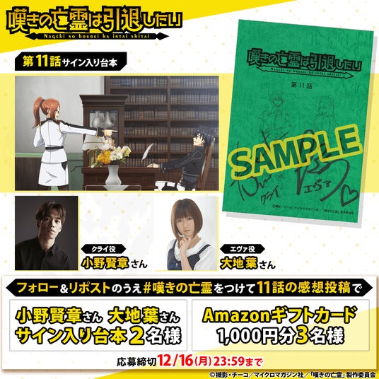 第11話の放送を記念して、小野賢章さん(クライ役)、大地葉さん(エヴァ役)の直筆サイン入り台本やAmazonギフトカード1000円分が当たるキャンペーンを開催いたします。