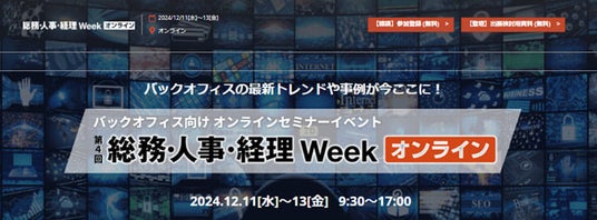 約20年の歴史を持ち、日本最大の規模で開催しているバックオフィス向け展示会「総務・人事・経理Week」を「オンラインセミナー」形式で開催。バックオフィス・経営のトレンドや事例が学べるセミナーを全て無料で聴講できます。