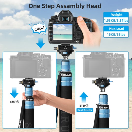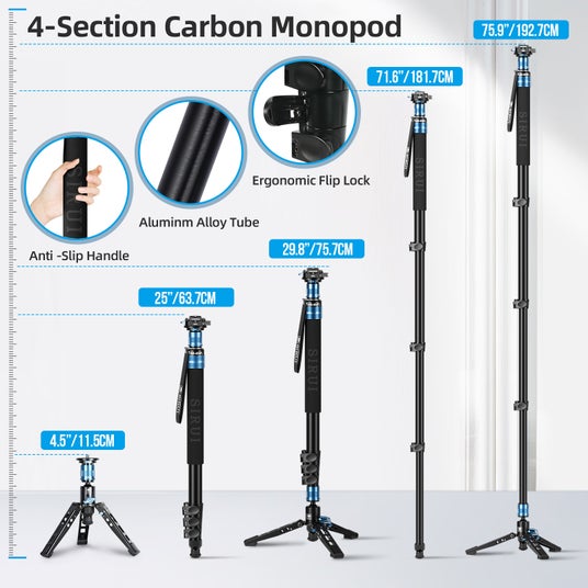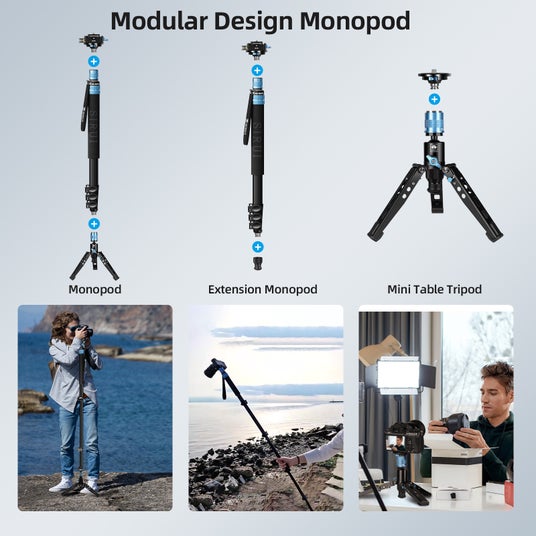 プロ仕様のアルミ合金一脚は、三脚に比べてスペースと重量を節約し、耐荷重26.4ポンド(12kg)で軽量設計。脚付きの柔軟な3-in-1三脚は、3つの使用モードを提供します:
