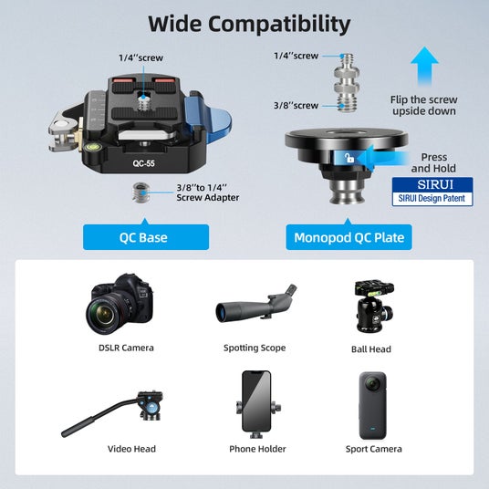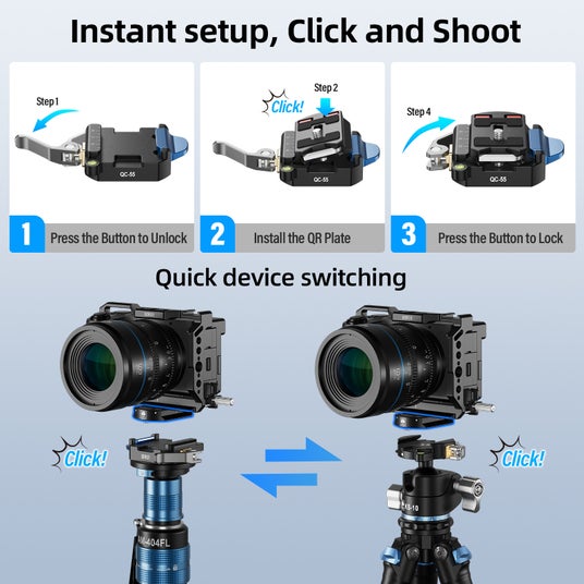 SIRUI QC-55 クイックリリースプレートキットは、超高速で取り付け・取り外しが可能。革新的なデザインにより、カメラのセットアップが簡単になり、カメラを「カチッ」とクランプに押し込むか、大きなロックを押すだけで瞬時に安定性を確保できます。Arca-Swissキットなら、横にスライドして取り付ける手間もありません。