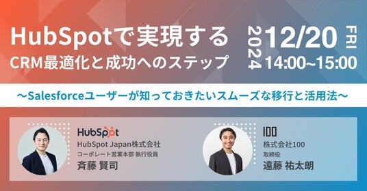 HubSpot Smart CRM(TM)の導入・運用支援サービスを通じてRevOpsソリューションを提供する株式会社100(ハンドレッド、本社:東京都世田谷区、代表取締役:田村慶、以下、100)は、HubSpot Japan株式会社と共催で、2024年12月20日(金)にオンラインウェビナーを開催します。本ウェビナーでは、SalesforceからHubSpotへの移行を検討中の方を対象に、具体的な移行プロセス、成功事例、そして移行後の成果を詳しく解説します。さらに、HubSpotの特長やCRMを効果的に活用するポイントについてもお伝えします。