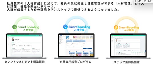 今年9月には大幅アップデートも実施し、高い評価をいただいている「人材育成」に加えて、「人材管理」「人材評価」機能も実装、人財に関することをSmart Boarding一つでマネジメントいただけるようになりました。