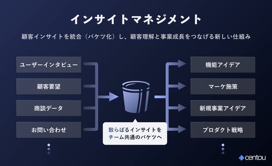「Centou」は、ユーザーインタビューや顧客サポートなどで得られた顧客インサイトを管理する、日本初のインサイトマネジメントクラウドです。