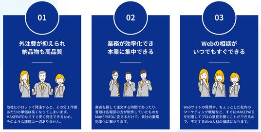 従来の外注業務はコストが高額になりがちでしたが、MAKEPATOは1作業1万円から依頼できるため、予算を効率的に活用可能です。これにより、無駄なコストを削減しながら高品質な成果物を得られます。
