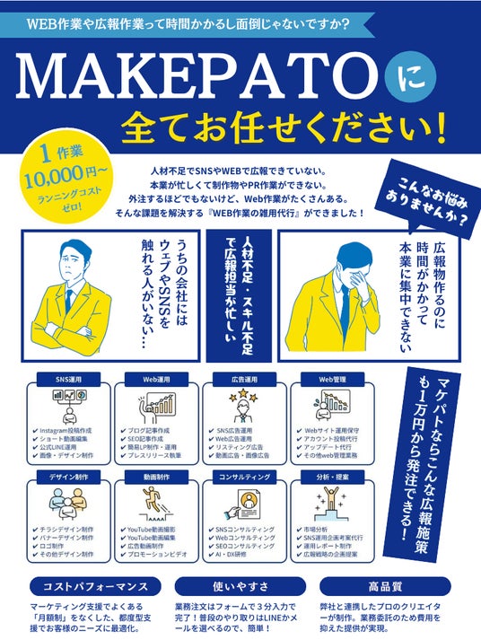 MAKEPATOはマーケティングパートナーの略称で、WEB業務や広報業務の雑務を代行するサービスです。特に広報やマーケティングにおける『急なタスク』や『外注するほどではない小規模なタスク』に対応し、これまでの外注に伴う多大なコストや手間の課題を解消する画期的な仕組みを実現しました。