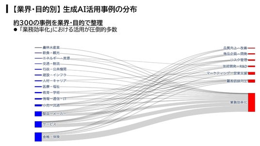 本レポートでは、金融・保険業界、製造業、小売業など、幅広い業界における約300の生成AI活用事例を収録。業務効率化やマーケティング支援、リスク管理など、多岐にわたる目的での活用成果を具体的に紹介しています。また、業界ごとの傾向分析を通じ、生成AIがもたらす社会的・経済的インパクトを可視化しています。