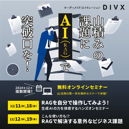 AIソリューションを提供するDIVXが、無料オンラインセミナー「生成AIの力を体感するハンズオンセミナー」「RAGで解決する意外なビジネス課題」を12月11日、12日、18日、19日に開催