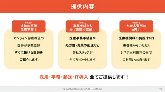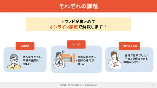 地域医療における医師不足や診療負担の増加という深刻な課題に対応するため、株式会社Genon(本社:大阪市北区梅田、代表取締役社長:高原千晶)は、クリニック向けオンライン診療BPaaS(Business Process as a Service)事業を立ち上げました。本事業では、地方自治体や医療機関と連携し、地域住民が抱える医療アクセスの課題に挑戦します。効率的な診療運営を可能にし、地域に根差した医療環境の実現を目指します。