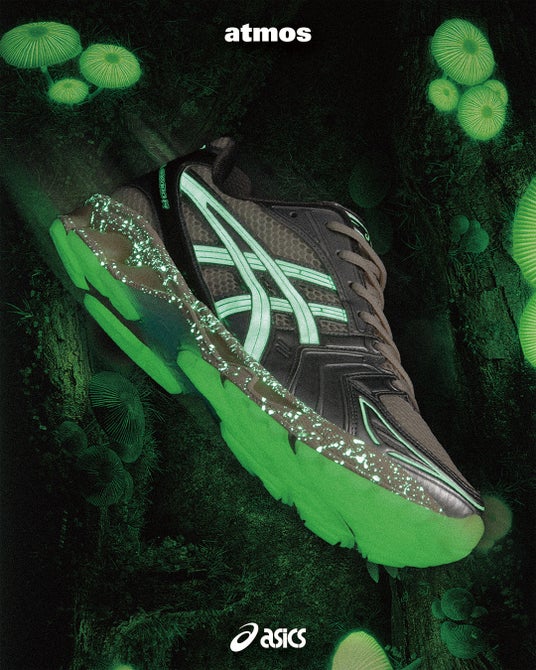 ASICS SportStyleのGEL-KAYANO 14をatmosと共同企画したスペシャルモデル。閃光を意識した流線的なデザインを特徴とし、レトロランニングならではのルックスが、Y2Kの流行に合わせてファッションスタイルにもフィット。そんなASICS SportStyleのトレンドを牽引しているモデルを、atmosらしくコンセプチュアルに展開したGEL-KAYANO 14は実際に日本にも生息する最も強く光るとされる発光キノコ、“夜光茸(Yakoutake)”をテーマに据え、GLOW IN THE DARKのデザインでアレンジ。