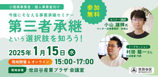 【2025年1月15日(水)開催】オープンネーム事業承継「relay(リレイ)」と世田谷区が連携し、小規模事業者・個人事業者向け事業承継セミナー「第三者承継という選択肢を知ろう!」を開催!