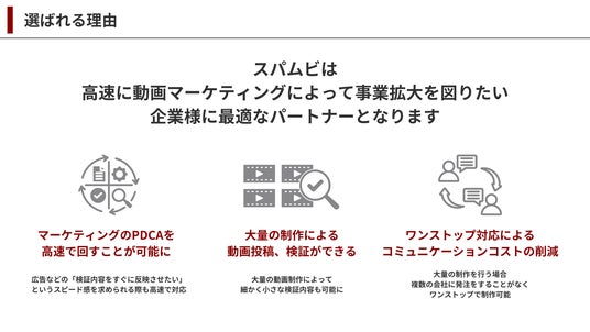 「スパムビ」は、企業様の「スピード」「コスト」「量」の全てを解決するショート動画制作サービスです。最短ご依頼当日に納品可能なスピーディーさに加え、大量発注にも対応。さらに、安価な価格設定により、少ない予算でも多くの動画を制作できます。