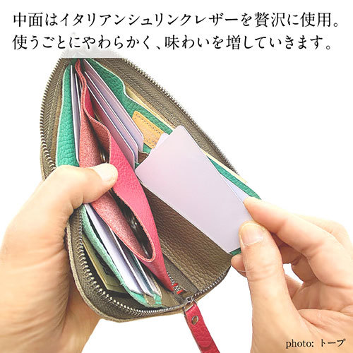 内部にはイタリアンシュリンクレザーを贅沢に使用し、柔らかな質感と耐久性を実現。合成皮革や生地を一切使用していないため、使えば使うほど手に馴染み、長く愛用できます。また、内側のパーツごとに色分けされた見やすいデザインも、使いやすさを追求した証です。