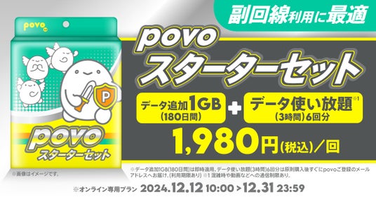 KDDI、沖縄セルラーは2024年12月12日から12月31日まで、povo2.0において、副回線におすすめのデータ容量がセットになった「povoスターターセット」を1,980円で提供します。