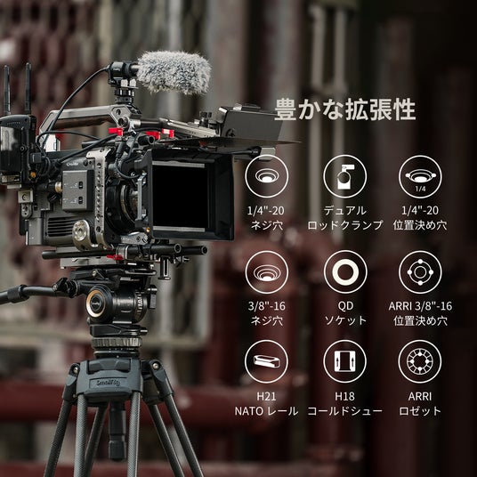また、手持ち撮影用の15mmデュアルロッドクランプ、安定した信号伝送のためのHDMIケーブルクランプ、コンパクトなセットアップのためのワイヤレスビデオ伝送システム用ブラケットも含まれています。さらに、ARRI 3/8"-16 位置決め穴、1/4”-20の位置決め穴、NATOレール、コールドシューなど複数のアクセサリーポートを備えており、多様なシーンでのセットアップとアクセサリーの統合を実現します。
