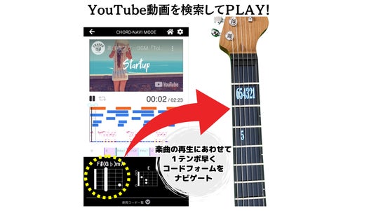 コード進行解析済みの国内外アーティスト10万曲以上のyoutube動画の中から好きな楽曲を検索し再生すると、楽曲の進行に合わせ1テンポ早くコードフォームを液晶指板上に表示します。