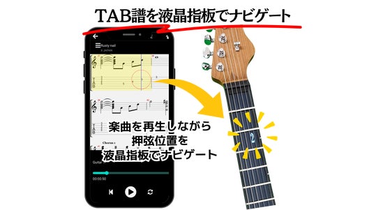アプリ内の楽曲リスト(120曲以上)もしくは、ユーザーが保存しているTAB譜ファイルを読み込み、楽曲を再生しながら位置を液晶指板上でナビゲートします。