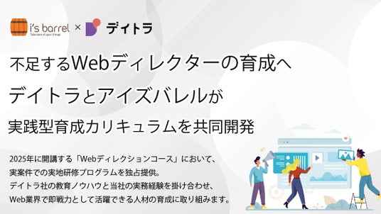 株式会社アイズバレル(本社:東京都渋谷区、代表取締役:飯澤絢人、以下「アイズバレル」)と、株式会社デイトラ(本社:東京都豊島区、代表取締役:大滝昇平、以下「デイトラ」)が独占提携により「Webディレクションコース」を2025年1月より開講致します。Web業界で不足するディレクター不足の課題に対し、即戦力人材の育成すべくデイトラ社に実践的なノウハウを提供を行い、即戦力人材の育成をサポートします。