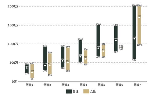 ※等級7では女性の報酬が男性の「149.5%」と逆転していますが、データの偏りを加味し、除外して考察しています。また提示の報酬額は等級ごとの中央値であり、報酬差の平均値において人数比を考慮しておりません。結果は参考値として解釈ください。
