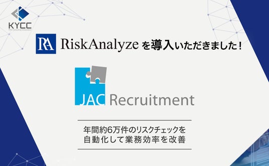 KYCコンサルティング株式会社(本社:東京都千代田区、代表取締役:飛内尚正、以下KYCC)が開発・提供する反社・コンプラチェックツール「RiskAnalyze」(リスクアナライズ)が、スペシャリストや管理職人材に特化した人材紹介事業会社である株式会社ジェイ エイ シー リクルートメント(東京都千代田区、代表取締役会長兼社長: 田崎 ひろみ)に導入されたことをお知らせいたします。