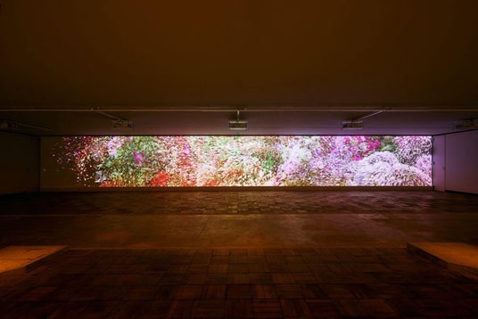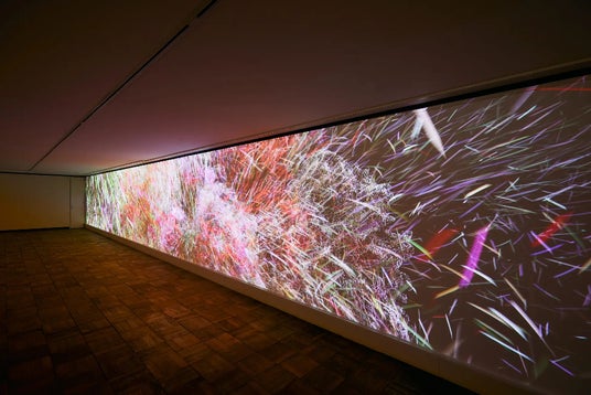 そこでNEORTでは、5台のプロジェクターとデジタルアートのリアルタイム生成が可能なシステムを導入し、全長約18mほどの大型なスクリーンを生み出し、作品を投影しております。現在は、アルゴリズムによって生成されるアート作品であるジェネラティブアートを軸とした展示を開催しております。